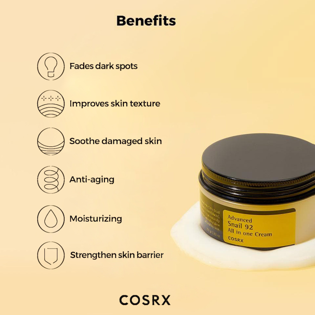 COSRX Advanced Snail 92 All In One Cream is a nourishing, gel-type moisturizer formulated with 92% snail mucin to hydrate, repair, and soothe the skin. This all-in-one cream helps strengthen the skin barrier, calm irritation after breakouts, and improve overall skin texture while delivering long-lasting moisture without a heavy or greasy feel.
