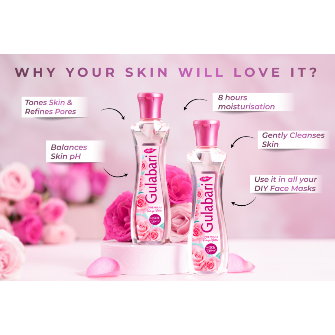 Dabur Gulabari Premium Rose Water is a multipurpose rose-toned face essential that helps refresh, cleanse, and tone the skin for a naturally radiant look. Ideal for daily use, this lightweight liquid works beautifully as a toner, gentle cleanser, or quick facial refresher—leaving skin feeling clean, soft, and revitalized.