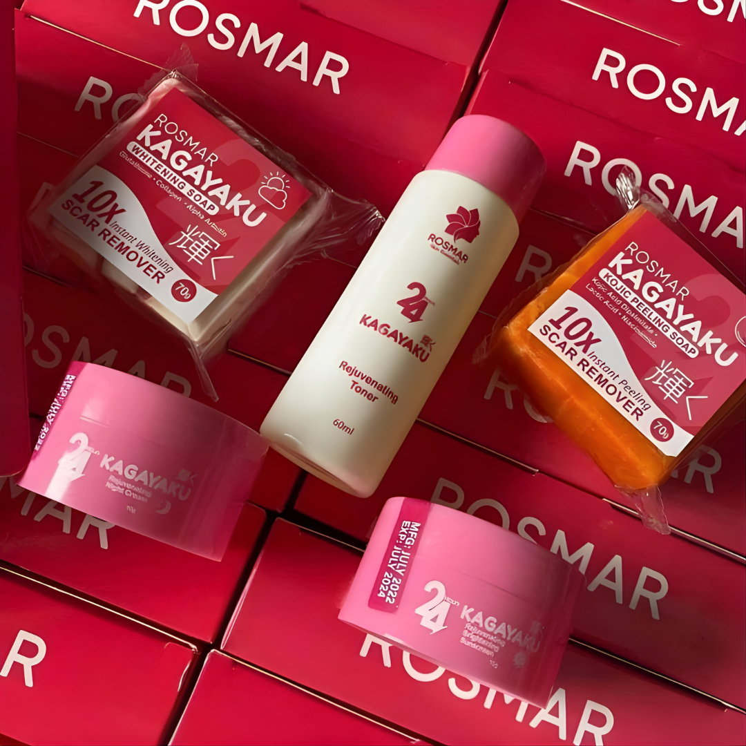 The Rosmar Kagayaku 24 Hours Rejuvenating Set is a complete skincare regimen that exfoliates, hydrates, brightens, and protects your skin for a radiant, youthful glow. This powerful 5-in-1 kit is designed to target acne, pigmentation, and dullness while promoting smooth, even-toned, and luminous skin. Perfect for daily use to achieve the coveted "glass skin" effect.