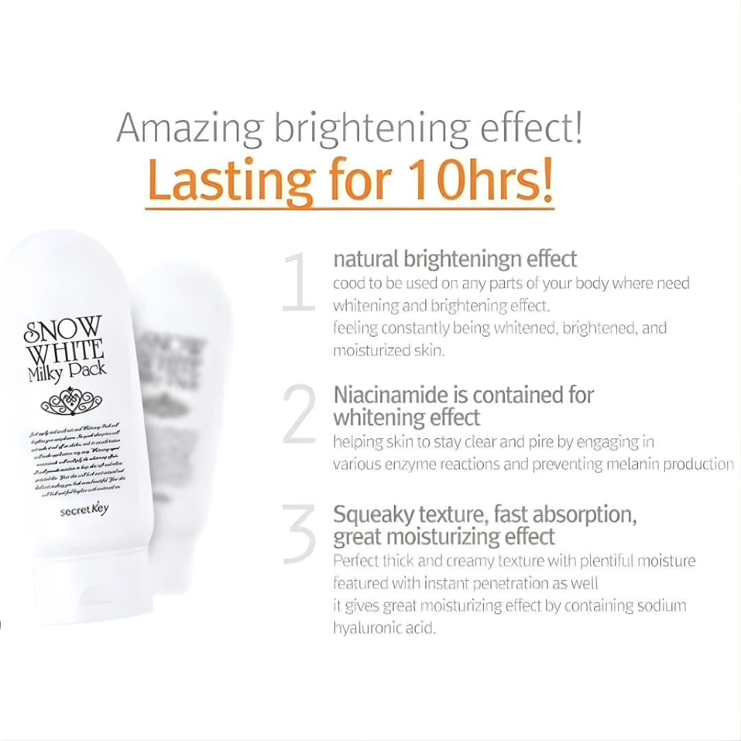 Secret Key Snow White Milky Pack is a creamy, moisturizing brightening pack designed to enhance skin radiance while keeping the skin soft, smooth, and well-hydrated. Its gentle formula melts into the skin, helping to create a naturally luminous and healthy-looking complexion.